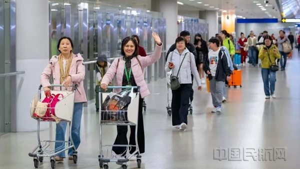 航班到港后,机场地服工作人员在廊桥口引导旅客们有序下机,送上欢迎回家的暖心问候。了解到航班上还有3名携带婴儿的特殊旅客后,机场工作人员主动帮助他们提取行李,让他们能尽早与家人团聚。