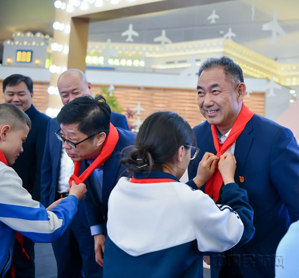 接机现场,学生代表踮起脚尖为前来迎接的机场集团领导系上了鲜艳的红领巾,表达感激之情;领导们为孩子们送上了精美礼物,表达了企业对孩子们的满满关爱与美好祝福。