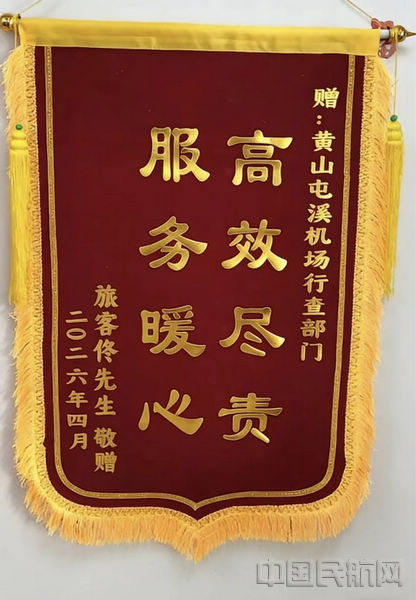 3月30日,某航班有6件行李未随飞机抵达黄山机场。其中,旅客佟先生的行李内装有急需药品。黄山机场工作人员第一时间做出回应,启动应急协调机制,联动航空公司将行李从北京转运至杭州,后派专车接回,于3月31日凌晨将所有行李送到旅客手中。4月2日,佟先生向黄山机场赠送“高效尽责,服务暖心”锦旗。