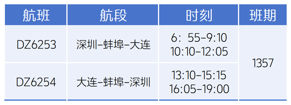 据悉,自 5 月 1 日起,深圳—蚌埠—大连航线正式常态化运营,每周一、三、五、日稳定执飞:去程为深圳宝安机场 06时55分起飞, 09时10分抵达蚌埠滕湖机场,10时10分从蚌埠滕湖机场起飞,12时05分抵达大连周水子机场;返程为大连周水子机场 13时10分起飞,15时15分抵达蚌埠滕湖机场,16时05分从蚌埠滕湖机场起飞,19时00分抵达深圳宝安机场。