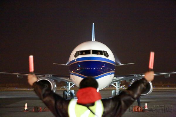 机务人员引导飞机滑入停机位(冯明远/摄)