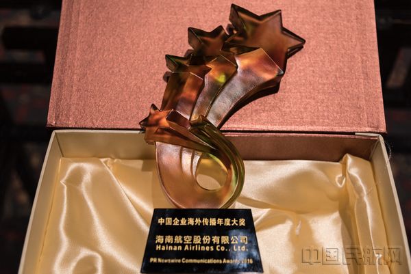 海南航空斩获的美通社“中国企业海外传播年度大奖”奖杯