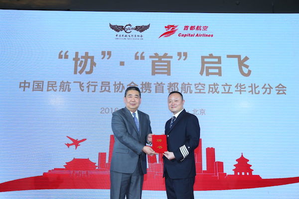 中国民航飞行员协会副理事长盛彪向首都航空飞行总监瞿涛颁发中国民航飞行员协会华北分会首任会长聘书