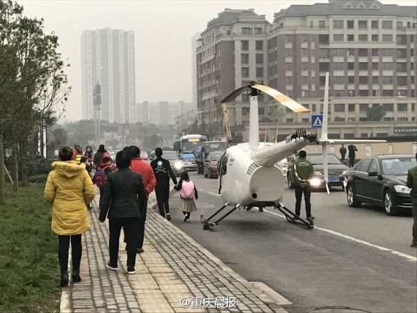 当日中午,当地媒体从沙坪坝区交巡警支队了解到,事件发生在沙坪坝区大学城南路树人小学旁,但事实并非网传那样。直升机是附近某楼盘搞的活动,于前一天下午就由拖车拉到现场。直升机一直停在路边,从未发动过。