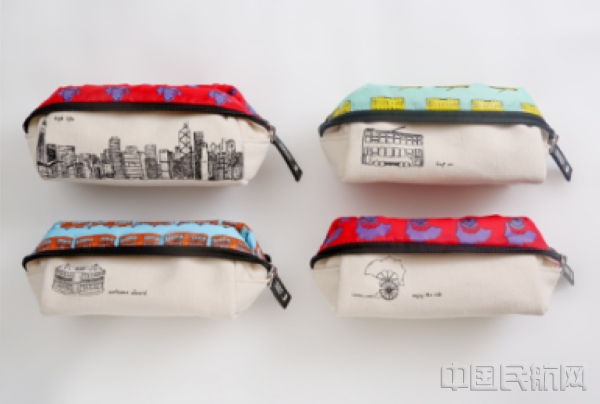 在澳洲和新西兰新航线上,当香港航空空姐从推车上取出四款护理包供乘客选择时,不少乘客都流露出惊喜之色。布满大海味道、海鸥渐渐飞高的维多利亚港湾,掠过香港川流不息的马路、发出叮叮响声的双层电车,载浮载沉、迎着朝阳晚霞驶过一个世纪的轮渡船和穿行大街小巷的黄包车……这些地道港式文化符号印在做旧风格的米黄色麻布上,一股港式气息扑面而来,四款花色均不相同,别致秀气。拉开拉链,缤纷艳丽的衬布跳脱出来,犹如跨过时间的长河来到摩登的香港,欢快的色系与素色的外观形成强烈对比,入眼入心。