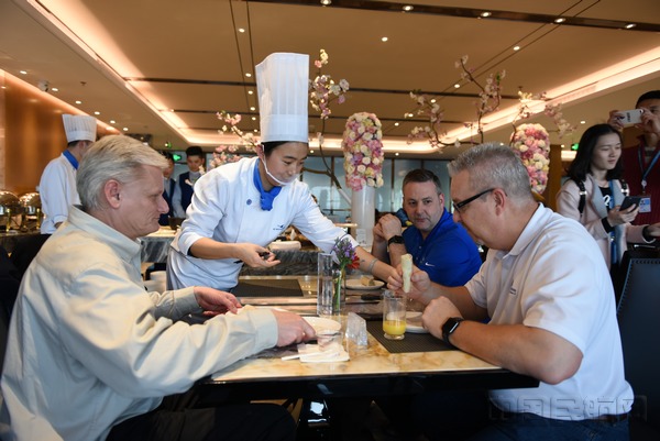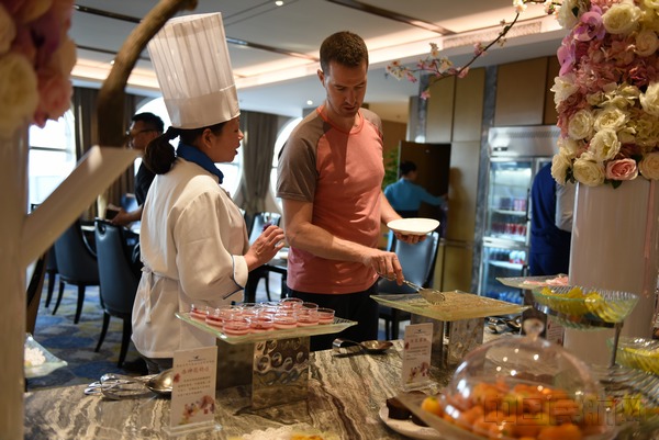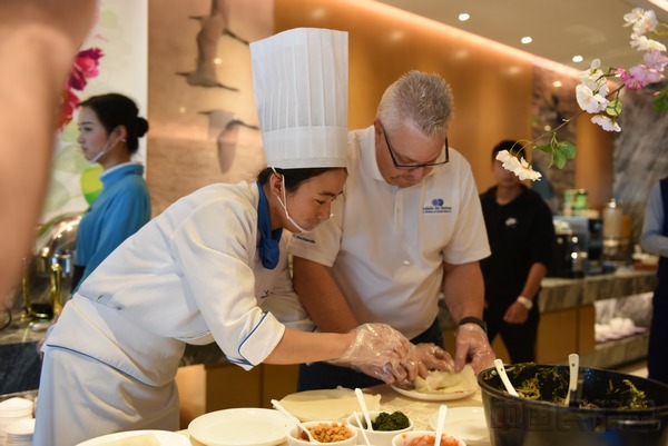 三月正是樱花的季节,空厨们以草莓慕斯为底,搭配樱花冻,制作出樱花草莓慕斯,果与花的巧妙融合,每一口都带有淡淡的香味儿,细腻顺滑。桂花清可绝尘,浓能远溢,具有美容养颜,化痰止咳之功效,以桂花烹制而成的马蹄糕,爽韧Q弹,桂香浓郁。玫瑰花酥饼以玫瑰花为馅料,伴以薄如蝉翼的酥皮,口感层层叠叠。空厨们精心挑选酸甜的洛神花,独创洛神花奶冻,口感清爽,冰凉适口,实为夏日消暑佳品。花香四溢的头等舱休息室,旅客们犹如置身于花海之中,享受着视觉与味觉的双重体验。除了"花"式菜单,现场还设置了春卷制作环节,旅客们根据自身喜好挑选配料制作,几位外国友人轮番学做春卷,趣味十足,还有一位旅客吃了一口春卷,露出满足的笑容。