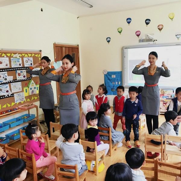 首先,青岛航空"青航魅力"示范组的乘务员们当起了幼儿老师,为孩子们播放了一段影视材料,给他们介绍了飞机客舱都由哪几部分组成,每个部分又都有些什么,飞机上又有一些什么人在做什么工作。生动的话语,夸张的表情成功吸引了孩子们的注意力,宝贝们睁大眼睛,生怕错过一丁点精彩的内容。