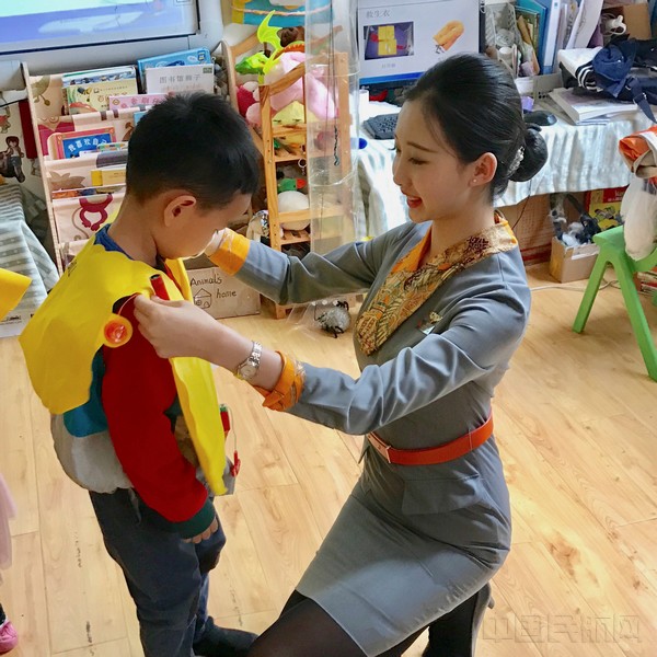 最后,在客舱老师们的安排下,小朋友们玩起了cosplay,男孩子有的扮演机长,大声下达起飞命令;有的扮演安全员,严肃认真巡视客舱;小姑娘当然是扮演漂亮的空姐,温柔地提醒旅客飞机马上要起飞啦,请系好安全带,关闭手机……孩子们一本正经地模样让客舱老师们忍俊不禁。孩子们用自己的表现赢得了客舱老师提前准备的飞机公仔和漂亮的钥匙链,极大鼓舞了孩子们的学习信心,也让第一次当幼儿老师的青航乘务员刘思瑶发自内心的高兴。看着孩子们灿烂的笑脸,她表示又找到了最初那个怀有蓝天梦的自己……