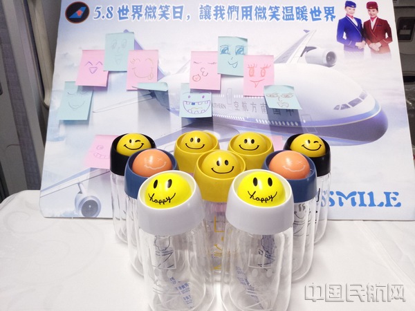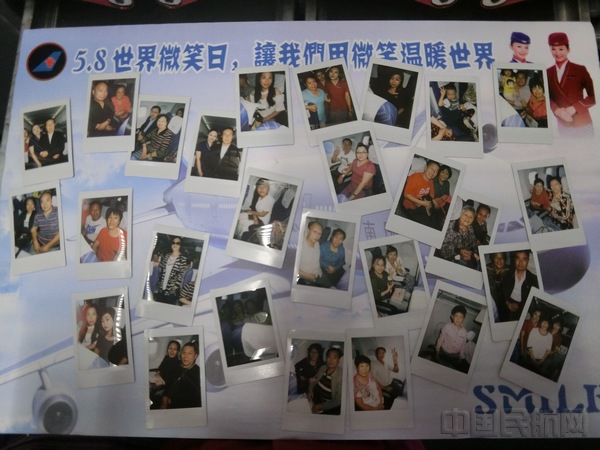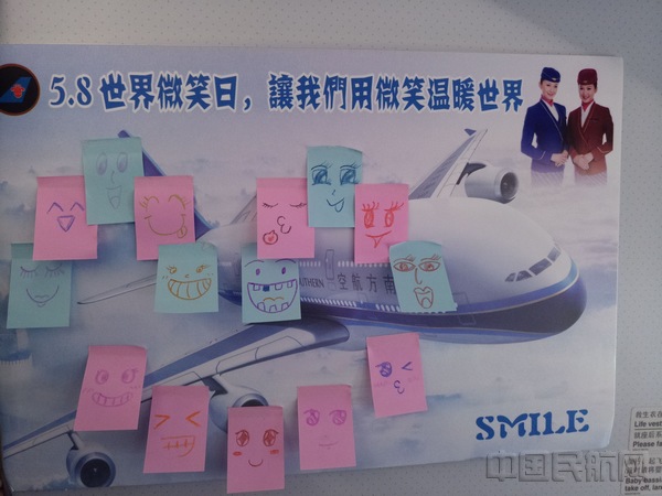 在接下来的有奖竞猜环节中,南航全国级青年文明号“含笑”乘务组准备了丰富多彩的脑筋急转弯问题,旅客们踊跃参与,积极举手抢答。在为答对的旅客们送上奖品—精美的微笑杯的同时,“含笑”也热情邀请旅客们在彩色便签纸上画下他们心中最美的笑脸,寄予世界最美好的祝福。各种笑脸上在宣传版上组成了一个大大的微笑图案,含笑希望通过这个活动告诉每个人要学会微笑的面对生活,面对各种生活中的困难和挑战,微笑是人类最美的语言。