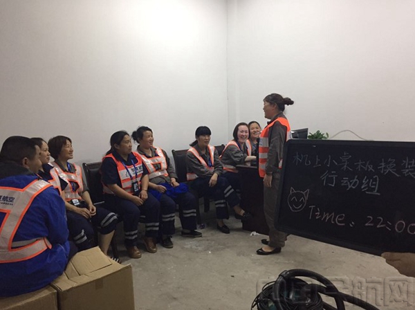 上机前,客舱地面服务部服务管理分部就做好了详细的工作计划,不仅为清洁队全员进行了粘贴小桌板的培训,还将当晚所有回渝航班的航后时间进行了统一的排表,以便提高工作效率。"在这里也要特别感谢清洁队队长敖雪玲及清洁队的所有队员,因为有了他们的辛苦付出,才有了今天的机上特色小桌板。"齐经理表示,17日当晚22:00,清洁队队长敖雪玲将当天值班的所有清洁队队员召集到清洁队办公室开会,布置当天小桌板粘贴工作。从22:30至第二天凌晨4:20左右,在清洁队的努力下,客舱地面服务部服务管理分部共贴完10架回渝飞机。5月19日-23日,经过连续5天的通宵达旦,此次机上特色小桌板粘贴工作全部告捷。