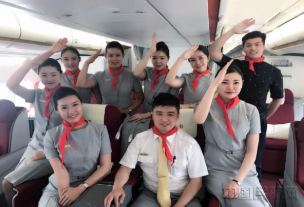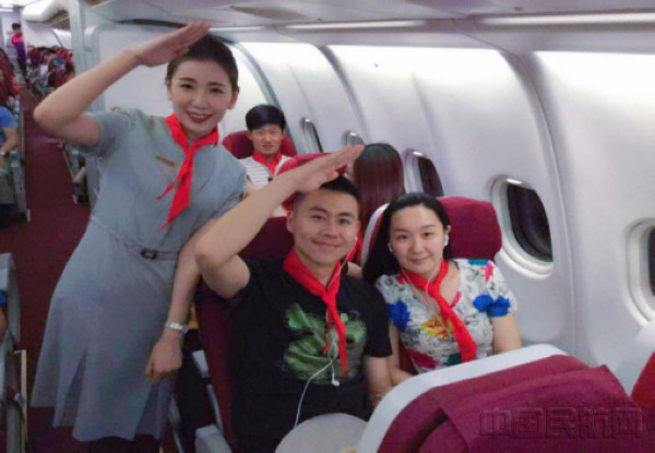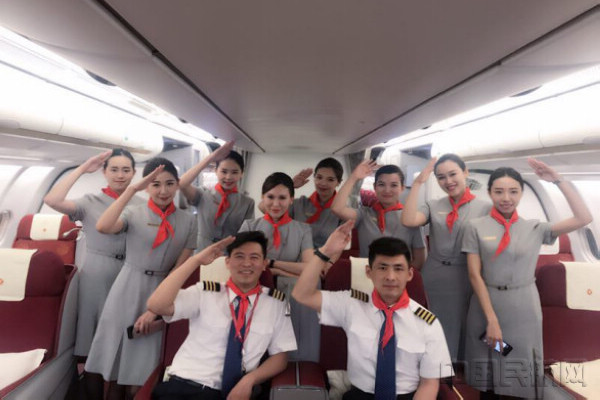 机组与乘务员佩戴红领巾合影留念