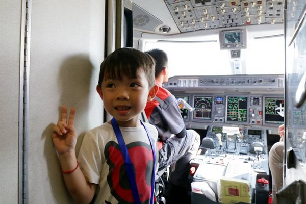 一位小朋友在飞机驾驶舱门口留影纪念