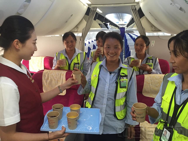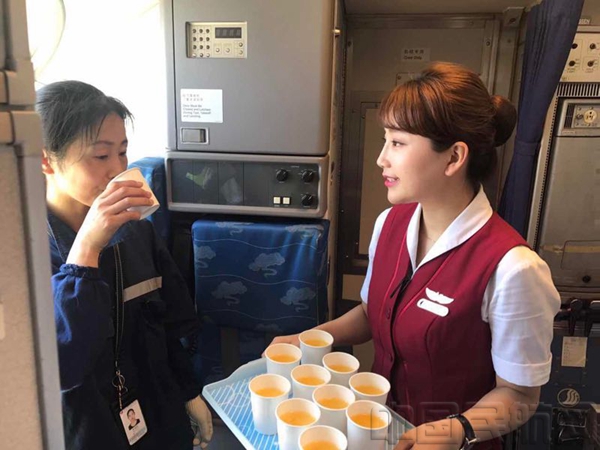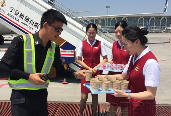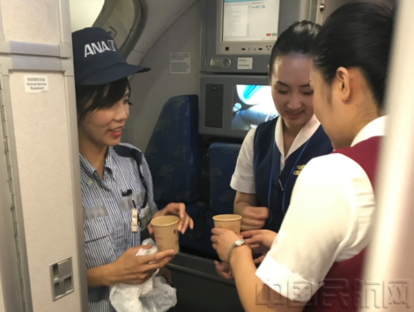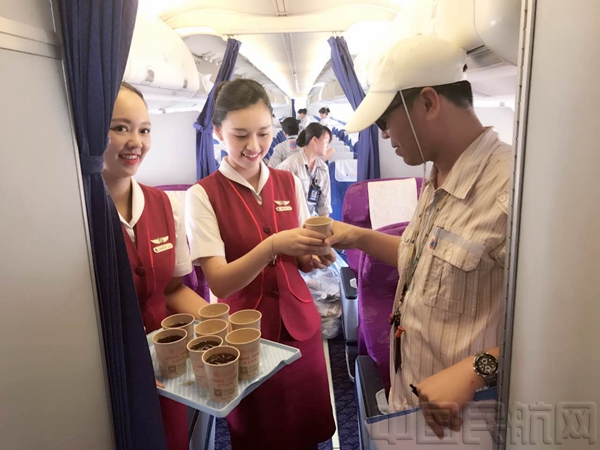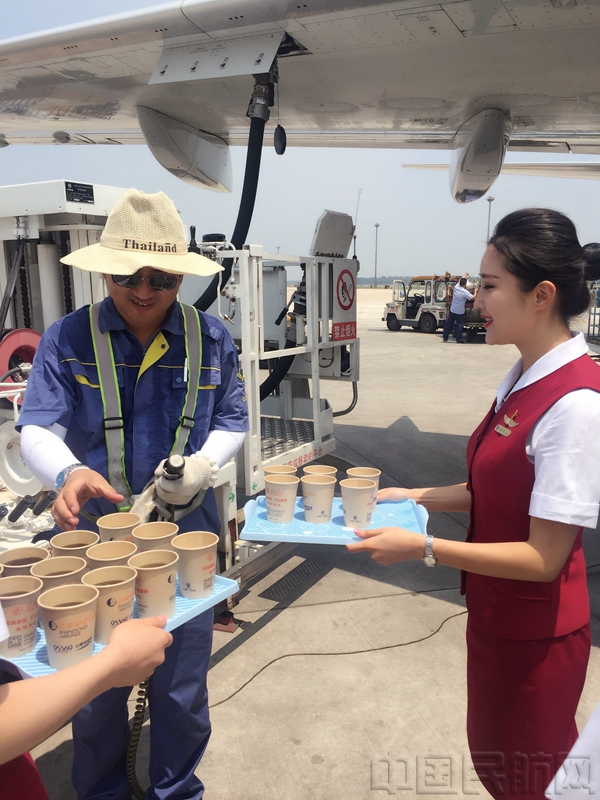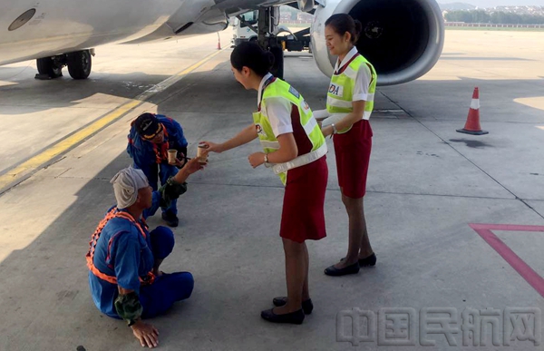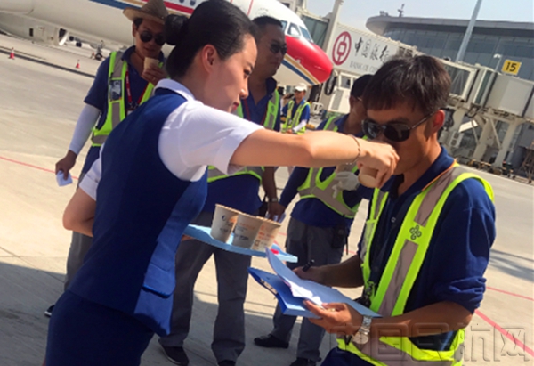 北京中队宗天利乘务组的姑娘小伙儿给机务送上饮品