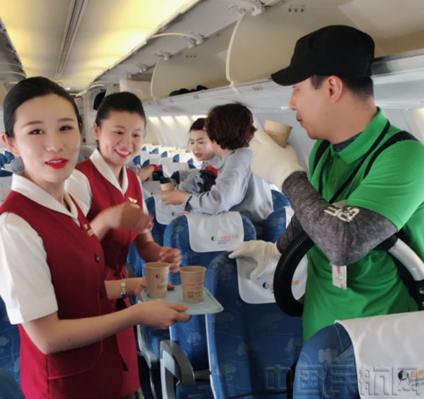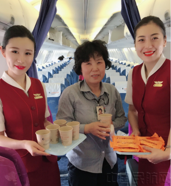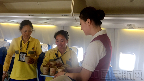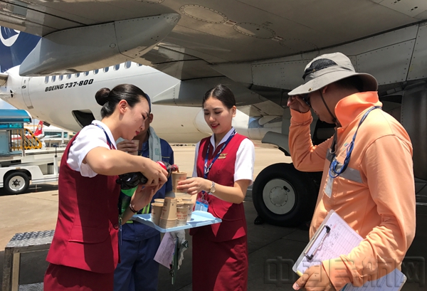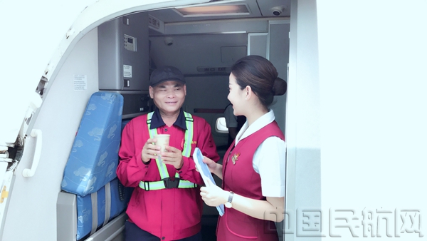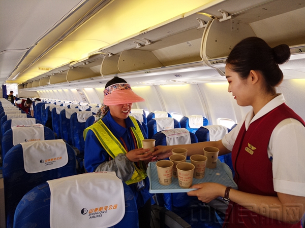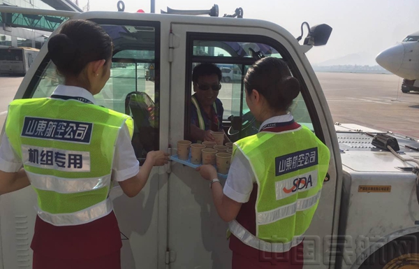 青岛大队田小甜乘务组的姑娘们将直接将饮料和水杯全部拿到机坪