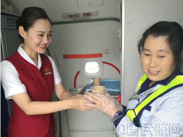 济南大队孙燕乘务组的姑娘们将冰水递到清洁队大姐的手中