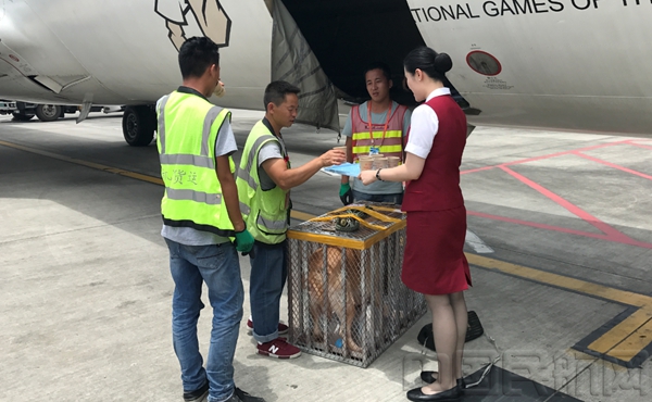 济南大队刘丽乘务组的姑娘们来到机坪时,贵阳的货运大哥们正在小心翼翼的准备将宠物狗放进货舱