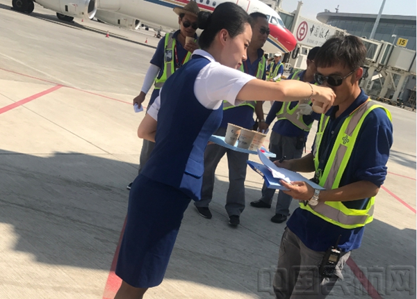 济南大队颜雪情乘务组的姑娘们走出客舱给机务、飞机监护还有货运大哥们送水