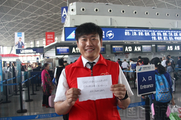 8月17日,来自飞行部737机型副驾驶陈晨和飞行部其他志愿者在清晨5:40准时到达候机楼,开始一天的志愿服务工作。这时的候机楼已是人头攒动,一位白发苍苍、颤颤巍巍推着一手推车行李的老人迅速引起了陈晨注意,他赶忙跑到老人身边询问。经了解才知道,老人已经80多岁了,和女儿一起出行,由于女儿先去办理其他业务,老人打算先去柜台办理值机手续。老人刚做完喉咙的手术,声音很沙哑,陈晨耐心的俯下身子一手搀扶着老人,一手推着行李车,和老人细细沟通,排队办理值机手续。志愿者热情的服务感染了老人,老人拿出纸笔不一会便写下一首藏头诗送给陈晨以示感谢:陈姓自古多义士,晨风送爽老顾者,先领风骚为和谐,生聚正能天下乐。"这封表扬信我要好好珍藏,把这份正能量不断传递下去。"陈晨和笔者说道。