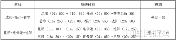 10月29日起,新开“沈阳=福州=芒市”航线,班期每日一班;10月31日新开“昆明=连云港=沈阳”航线,班期为周二、四、六执飞。其中,“芒市=福州”、“芒市=沈阳”、“昆明=连云港”为瑞丽航空独飞航线,航班均由波音737型客机执飞。
