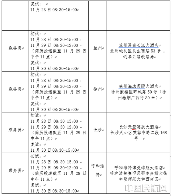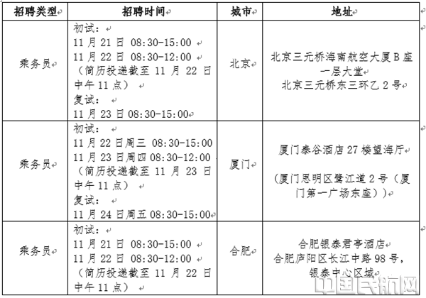 据了解,海南航空2017年11月全球乘务员招聘站点行程安排如下: