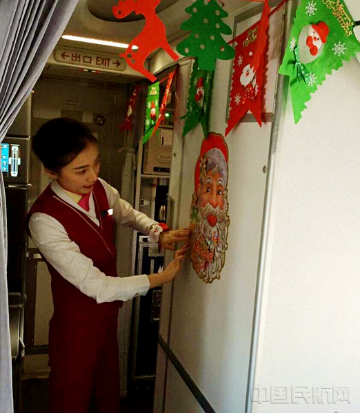 乘务组预先上飞机装扮客舱,用圣诞贴纸、雪花、彩带等营造圣诞氛围。乘务长更变身“带着圣诞帽的老爷爷”,让旅客一上飞机就被“吸引”了。