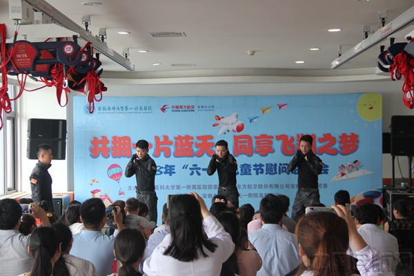 庆祝六一,关爱孩子,奉献爱心。上午9点,联欢表演活动正式开始,东航安徽分公司的青年克服执行完航班带来的疲惫,抖擞精神,为的小朋友们送上精心准备的“爱心礼物”。互动节目《系丝巾》、武术表演《擒拿格斗》、朗诵《相信未来》,以及安医大一附院带来的各项精彩节目,为小朋友们带来了一整场的快乐。