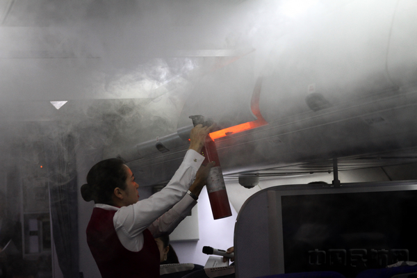 模拟客舱行李架失火乘务员拿灭火器正在灭火