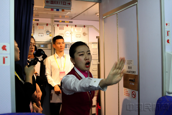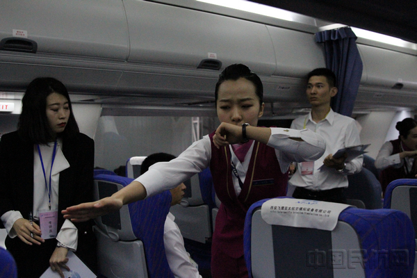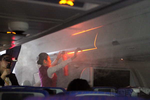 模拟客舱失火有烟雾乘务员正安抚旅客维持客舱秩序