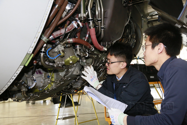 南航大连机务人员检查C发发动机管路(李俊青 摄)