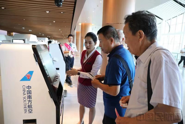 模拟旅客在南航工作人员引导下体验自助托运设备