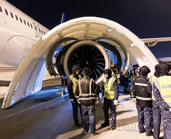 11月18日,准备工作一切就绪,在定检维修分部经理的带领下,换发工作正式拉开序幕。换发工作风险多、拆装多、航材工装多,组员们严格执行“四个意识”“五个到位”,按照工卡步骤谨慎仔细地开展每一步工作,互检与必检相结合,三级复查缺一不可。11月的机坪寒风凛冽,初冬的阵雨也对换发现场带来了有诸多不利的影响,而在自制的充气机棚里,换发小组丝毫不受外界的影响。