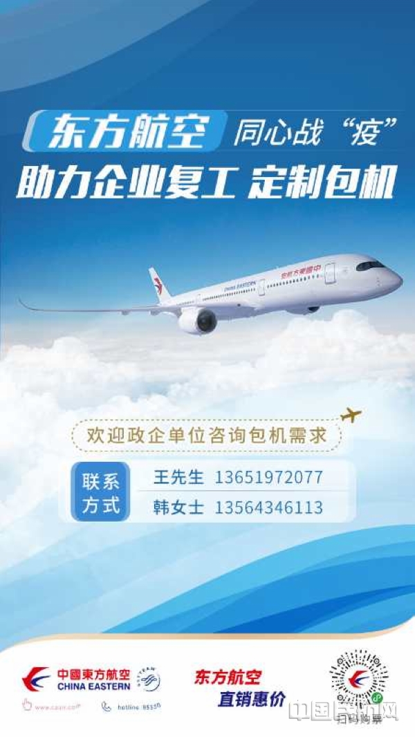 2月18日,东航发布了包机主题海报——“东方航空同心战‘疫’,助力企业复工,定制包机”,并通过东航官网、微博、“东方航空”微信公众号同步传播。东航全面接受企业有关复工复产包机的申请,凡是全国各地企业有复工包机需求的,50人及以上即可成团(其中湖北地区航线除外)。为进一步做好一站式服务,东航还特别推出了“特约专车,国内接送”的服务产品,为企业复工保驾护航,提供全面出行保障。东航全球营销机构围绕社会企业复产复工,积极主动联系、洽谈、组织、运输各地工商业返程复工人员事宜。