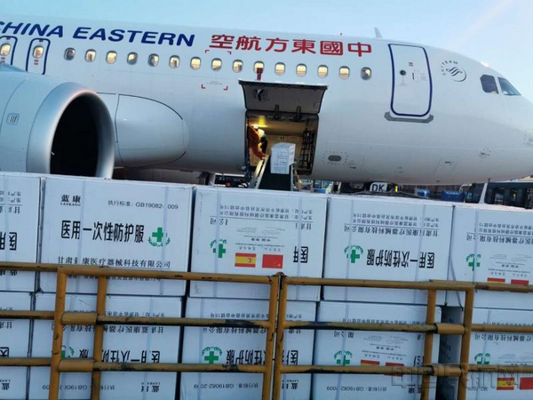 东航甘肃分公司三架航班分别于12:35、14:00、20:15起飞,共运送3085公斤“甘肃产”医用防护服2万件、KN95型医用防护口罩2万只、一次性医用口罩14万只等医用防护物资,分别经停上海发往西班牙纳瓦拉自治区、罗马尼亚阿尔巴县等我省国际友好省州和法国热尔布博瓦市及法国“一带一路”美丽乡村联盟等友好组织,以支持和帮助他们抗击新冠肺炎疫情。