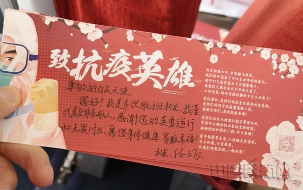 航班机组为医疗队员们精心准备了空勤人员签名的纪念登机牌。南京机场举行“过水门”仪式,以安全高效、顺畅贴心的服务保障,迎接援鄂医护人员回家。
