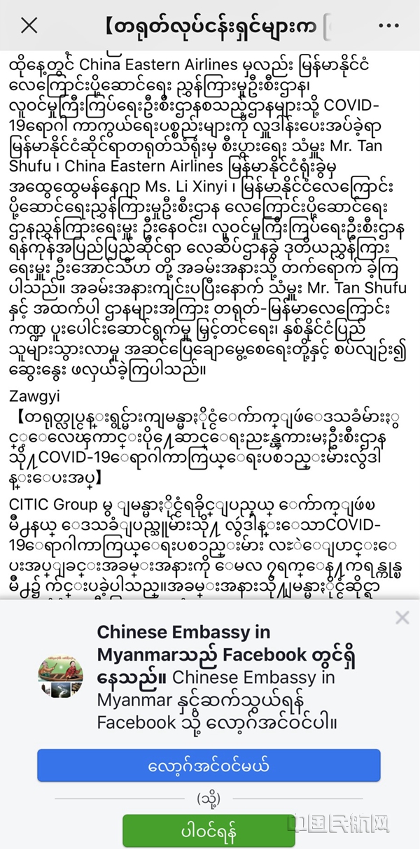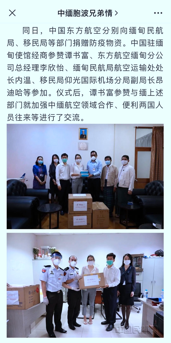 我国驻缅大使馆在社交媒体上用中缅双语点赞东航的捐赠(东航销售委供图)