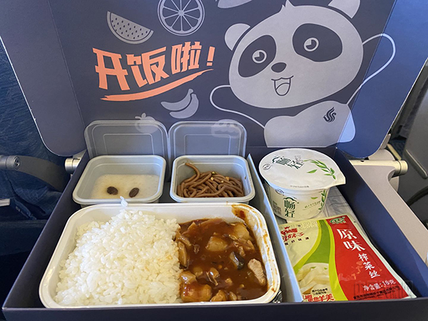实事求是地说,这盒“麻辣香锅”实在没法和饭店里那一锅香辣四溢的菜相比,但考虑到机上餐食的种种限制,特别是要满足可以二次加热的条件,能设计出这样带有浓郁地方特色的餐食,就让人感觉到了满满的诚意。“对比从北京过来时的蘑菇饭,就觉得成都这盒饭更好吃些。”我邻座的旅客也是位经常走南闯北的“飞客”,显然对这盒特色饭更满意。