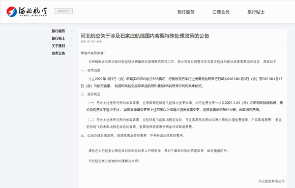 中国民航网讯:1月5日,河北航空发布关于涉及石家庄航线国内客票特殊处理政策的公告。公告称为配合石家庄做好新型冠状病毒肺炎疫情联防联控工作,临时调整涉及石家庄航线的部分旅客客票退改规定,具体内容如下: