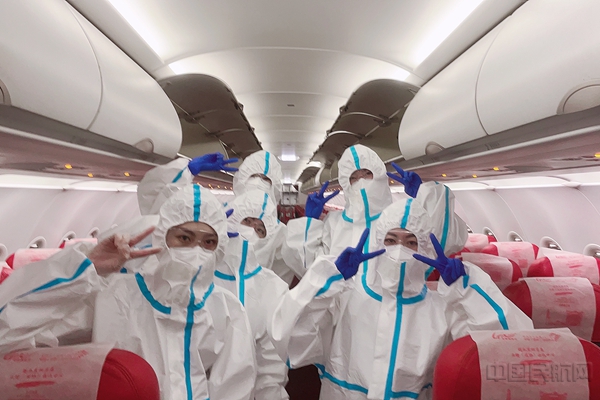 北部湾航空GX8908航班乘务组穿戴防护服执行航班任务