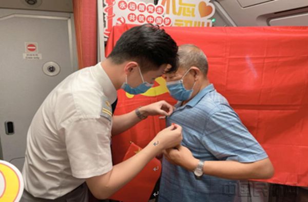 乘务员为旅客佩戴党徽