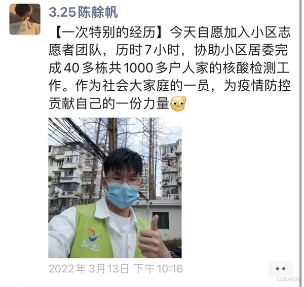 陈艅帆是机场地服公司一名团员青年,他在得知所在小区将开启核酸检测后,主动报名参加抗疫志愿服务,协助小区检测点建设、维持核酸采样现场秩序。在随后的社区封闭管控期间,他每天奔波超过12小时,协助社区居民出示检测码、组织体温检测、给独居老人送饭、为被封闭楼栋的住户送快递。