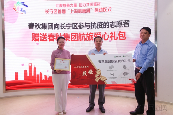 《中国民航报》、中国民航网 胡夕姮报道:9月5日上午,“汇聚慈善力量,助力共同富裕”——长宁区首届“上海慈善周”活动在春秋国旅大厦举行了启动仪式。会上,春秋集团向“守沪”英雄赠送了免费机票、终身金卡、观光巴士车票、旅游产品立减优惠等爱心航旅大礼包。长宁区民政局副局长周全民、上海市慈善基金会长长宁区代表处副会长李鸿、春秋集团董事、春秋旅游副总经理周卫红以及长宁区社区防疫志愿者代表等出席了启动仪式。