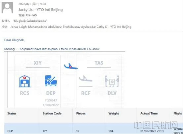 接力棒交到圆通手里,但剩下的时间却不多了。刘平几乎是连夜赶出的方案,双方最终敲定由8月1日圆通航空的西安—塔什干航班承运这12箱近200公斤衣物。“我们对比了上海、北京、广州飞往中亚的其他航班,只有圆通航空这班距离最近、还是直飞,用时最快。”距刘平测算,这趟今年6月新开的圆通航空中亚航线,能为本次运输节省出约3天时间。