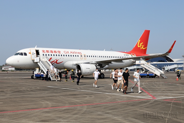 当天上午9时30分,本次安保综合实战演练在南宁吴圩国际机场停机坪拉开帷幕。参演单位通过“实战”演练的方式验证收到匿名炸弹威胁电话后的相关应对措施,先后开展信息接报、先期响应、处置会商、现场处置、排除威胁、后续处置等六个演练项目。在演练中,北部湾航空飞行、乘务、安保等机组成员密切开展协同配合,明确分工、处置果断,在演练过程中及时进行信息通报并启动相关应急程序,确保航班旅客安全“撤离”飞机。随后,相关部门派出专业排爆人员进行登机检查,将飞机上的疑似“爆炸物”转移至地面进行有效处置,演练取得圆满成功。