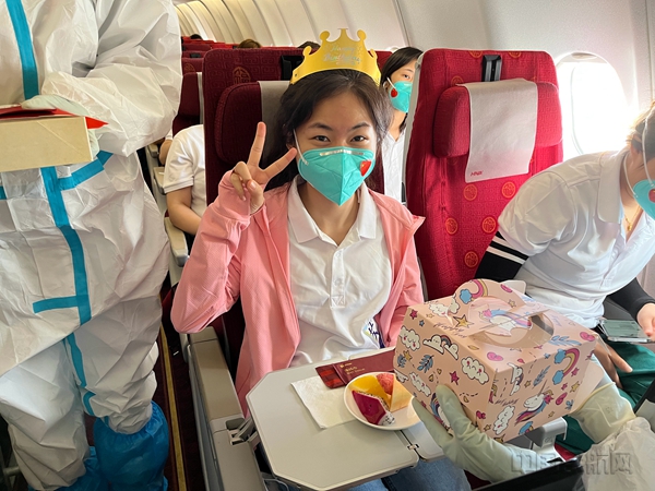 随后,机组人员给医护人员赠送手绘明信片,向援琼医疗队代表赠送飞机模型留作纪念,为过生日的医护人员送上生日惊喜,并通过《听我说,谢谢你》手势舞和《歌唱祖国》表达了对援琼医护人员的感恩之情,以及对美好生活的祝愿。