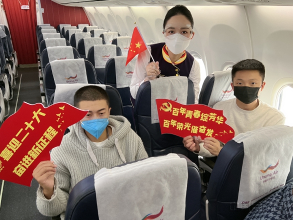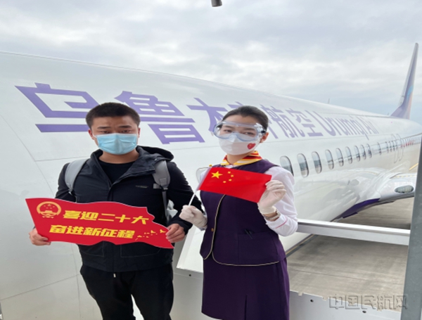 “旅客朋友们大家好,欢迎选乘海航航空旗下乌鲁木齐航空‘奋进新征程 建功新时代’红色主题航班,本次航班由乌鲁木齐航空空中党员先锋岗机组执飞,我们将与您在万米高空一同感恩党、感恩祖国,共享美好的旅程。”随着悦耳的行礼广播响起,以庆祝党的二十大胜利召开为背景的主题航班顺利启航。