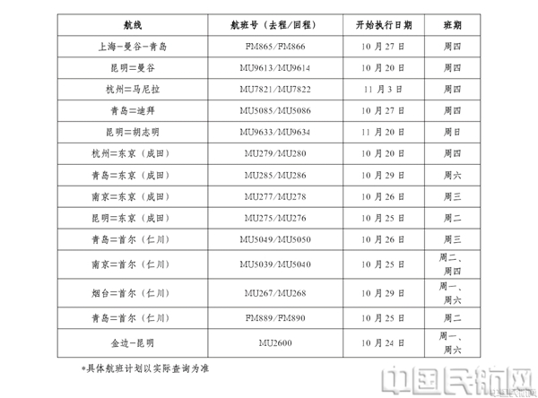 此次新增的国际航线将于10月20日起逐步开始执行,其中昆明—曼谷、杭州—东京成田航线20日起恢复,每周1班;金边—昆明航线24日起增至每周2班,昆明—东京成田、南京—首尔仁川、青岛—首尔仁川航线25日起恢复;南京—东京成田、青岛—首尔仁川航线26日增至每周1班;上海—曼谷—青岛、青岛—迪拜航线27日增至每周1班;青岛—东京成田、烟台—首尔仁川航线29日起执行。