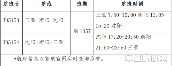 据悉,三亚—衡阳—沈阳航线班期为每周一、三、五、七。去程航班号为JD5153,7:50由三亚起飞,10:00抵达衡阳,12:05由衡阳飞,15:20抵达沈阳;回程航班号为JD5154,17:20由沈阳起飞,20:50抵达衡阳,21:50由衡阳起飞,23:50抵达三亚(航班信息或有变化,具体以首航官网实时查询为准)。