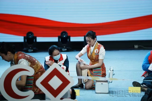 本次大赛分为心肺复苏、AED(自动体外除颤器)使用、创伤救护的止血、包扎、固定等多个应急救护项目。西藏航空客舱服务部急救参赛组(简称“西藏航空参赛组”)代表双流区,与成都市其他25支区级代表队同台竞技。西藏航空参赛组以严谨扎实的精神风貌和娴熟规范的操作技术,全面展示了西藏航空客舱乘务员的应急救护技能水平,获得了理论考核第一名、风采展示第一名、情景演练第二名,最终荣获本次大赛团体奖第二名。
