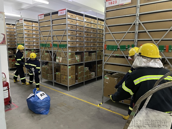 此次演练模拟航材库电源短路导致货架物资起火。发生火情后,消防报警系统自动报警,消防值班员收到报警信号后立即通报信息,有关人员严格执行信息通报程序,使用现场灭火器控制火情。随后,基地迅速启动消防应急处置预案,各小组快速行动,灭火行动组召集微型消防站队员和基地各单位义务消防员开展初期火灾扑救;警戒组划出警戒区域、安全区域,开展警戒、消防车指引,禁止无关人员、车辆进入火灾现场;疏散组组织所有人员从消防通道快速撤离至安全地带;工程运行组安排工程人员第一时间切断非消防电源及电梯电源。在各单位和小组的通力配合下,火源被顺利扑灭,全部人员安全撤离。