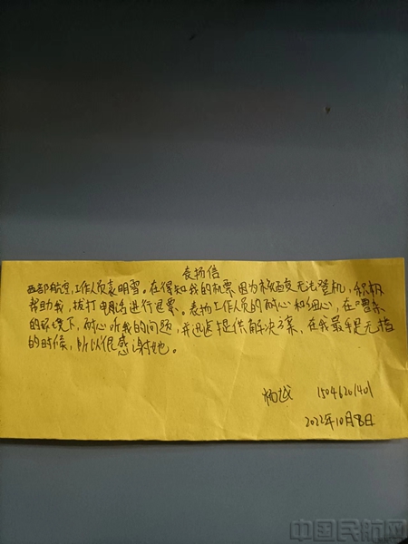 旅客为工作人员周虹任写下的感谢信